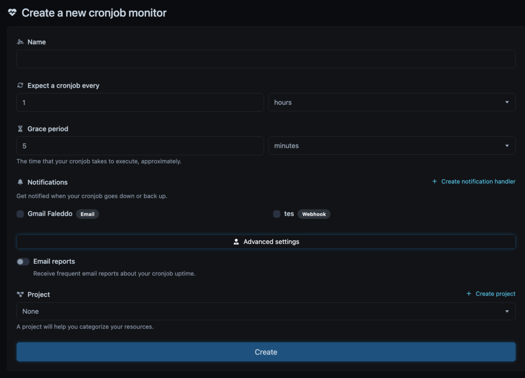 - Project (optional): Assign your cron monitor to a project to organize related tasks under the same group.