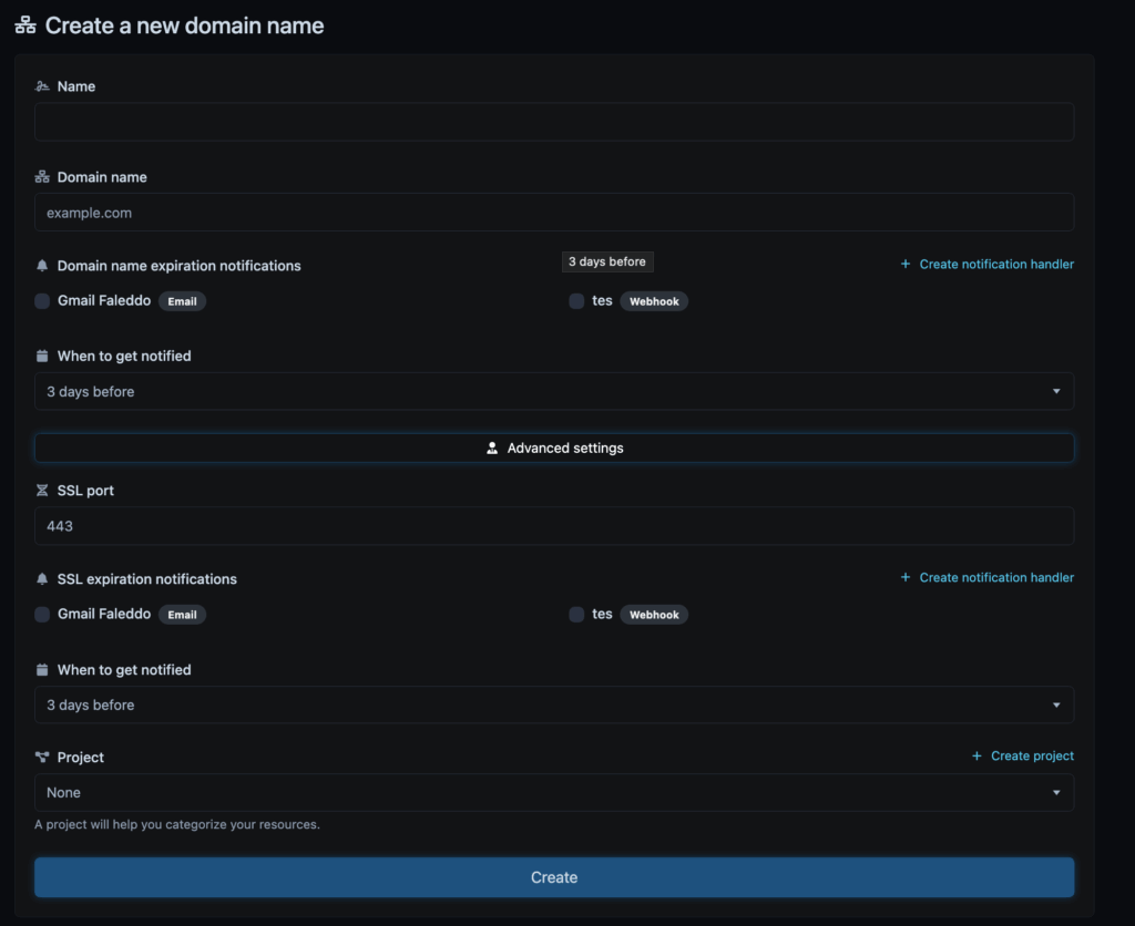 - Project (optional): Assign the domain monitor to a project to help organize multiple domains under one category.