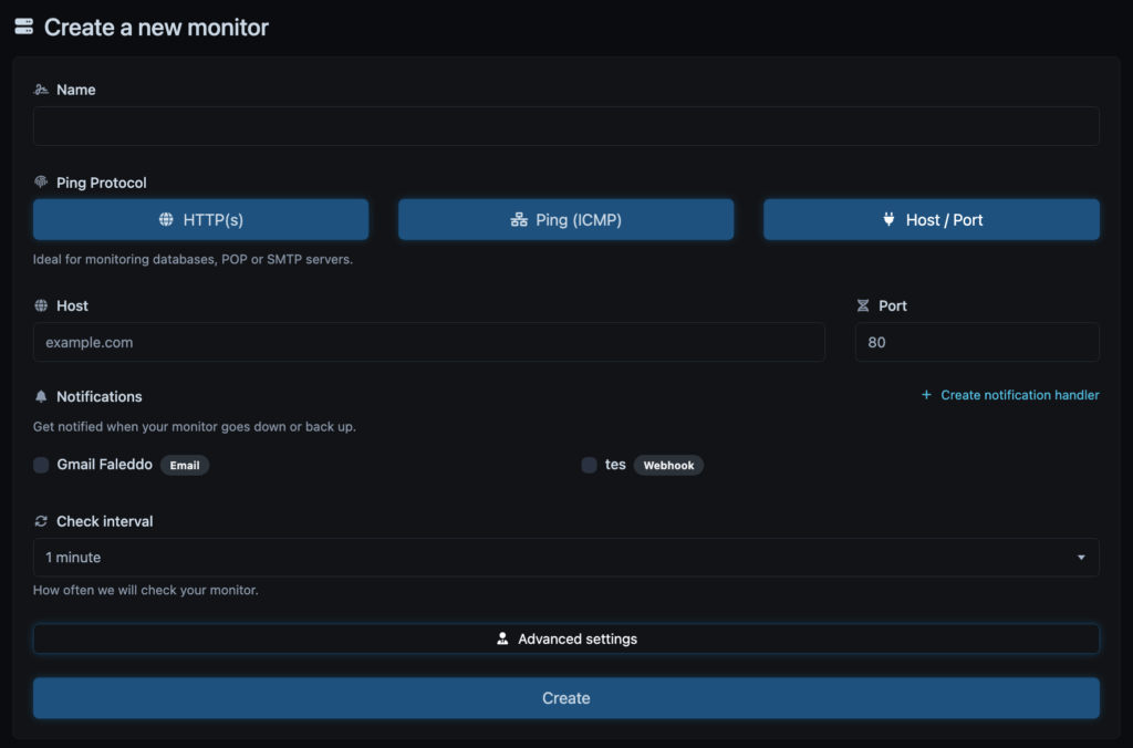 Once done, click Create to activate the monitor. Your new Host/Port monitor will start checking the connection status to the specified host and port, giving you continuous insights into your service’s uptime and availability.