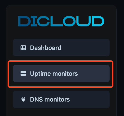 After logging in to your Dicloud dashboard, click Uptime Monitors from the left sidebar. This section lists all your uptime monitors, showing each monitor’s status, uptime percentage, and average response time.