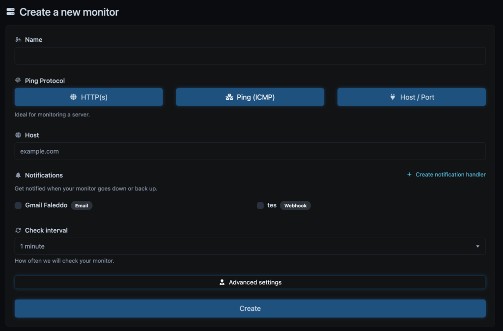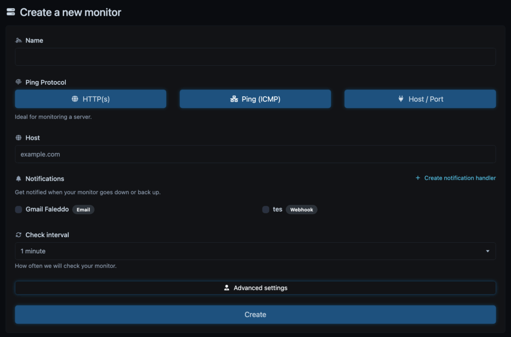 example.comor192.168.1.10. - Notifications — Choose how you want to be alerted when your host goes down or comes back online.